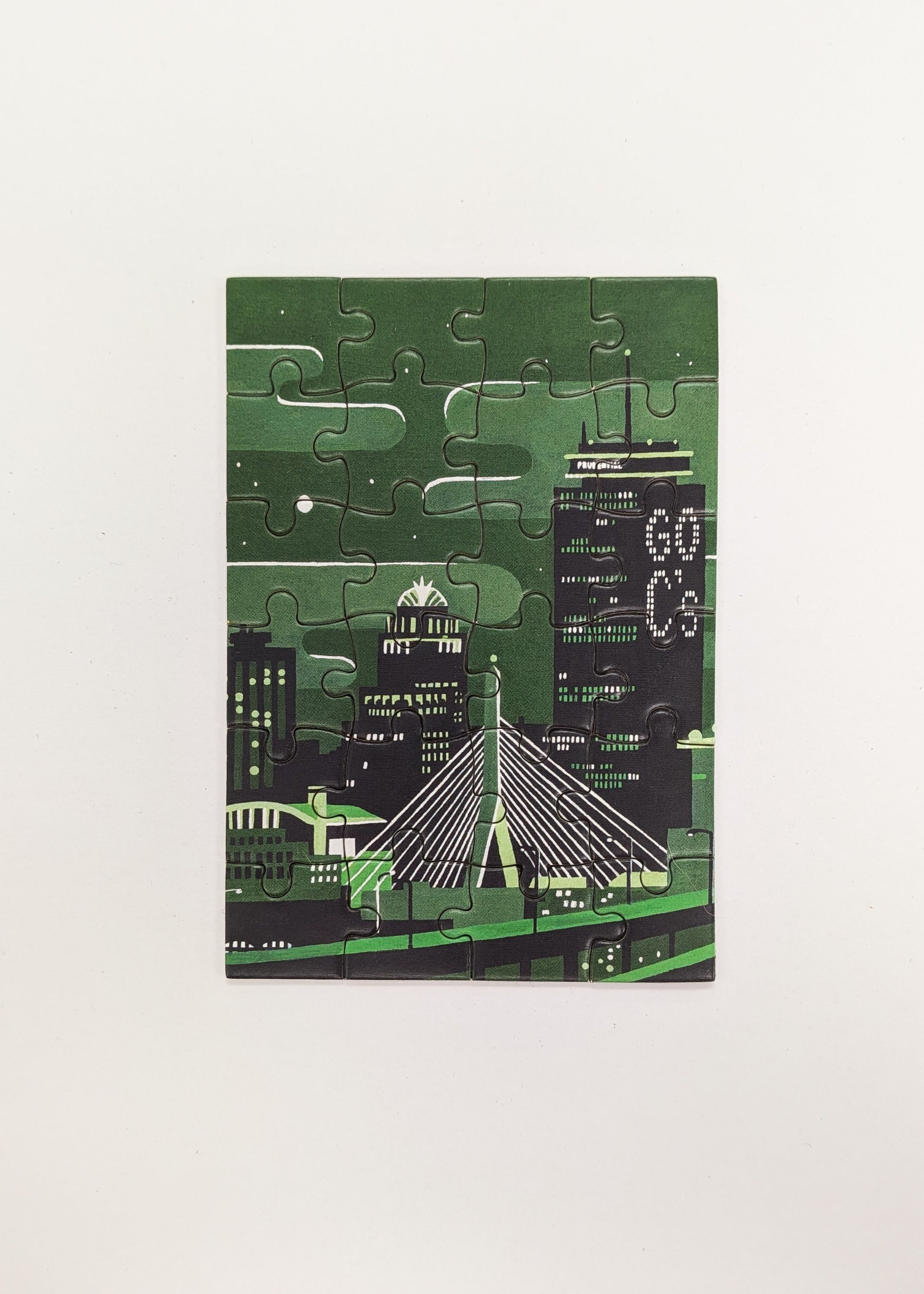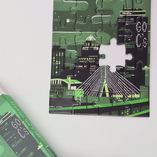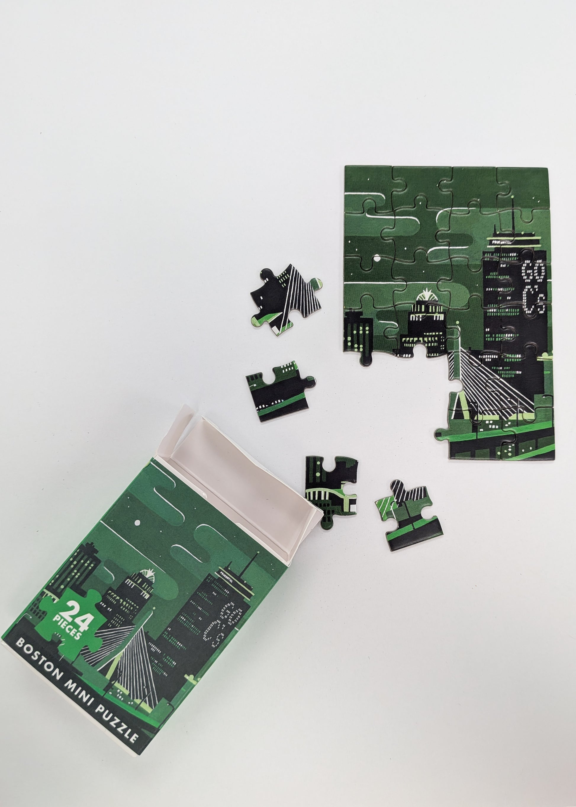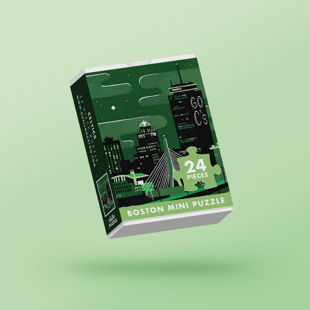 Celebrate Boston sports pride with this 24-piece mini puzzle featuring the city lit up for the Celtics. The Prudential Center shines with its famous “GO C’s” window display, while the TD Garden and the Zakim Bridge glow proudly in the foreground. Painted in bold greens, crisp whites, and deep blacks, this artwork captures the energy of a true Celtics night in Boston. Compact and colorful, it’s the perfect gift for fans who love puzzles almost as much as game night.